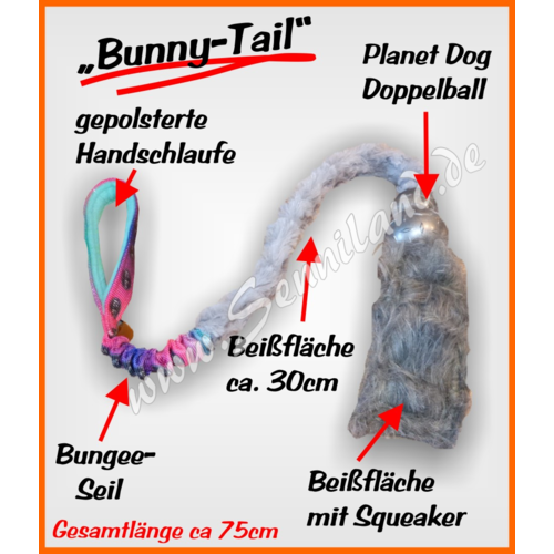 Original "Ke-Hu" Bunny-Tail. Universelles Wurf-, Zerr- und Apportier-Spieli. Ca 75cm Gesamtlänge mit verschiedenen Beissflächen, Bungee, Squeaker und Planet-Dog Ball. Echt der "Hammer" unter den Spielis